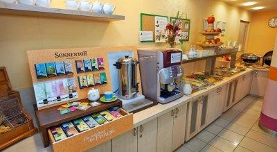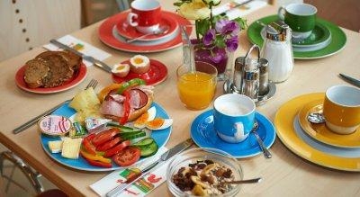 В ресторане яркая посуда повышает аппетит и создает настроение. Вкусный и разнообразный завтрак: сосиски (разбираются в первую очередь), по 3 вида колбасы и сыра, свежие овощи, соусы, яйца в крутую. Есть хлопья с молоком, добавки к мюсли - семена, орехи. сухофрукты. Сладкий и несладкий йогурт. Из фруктов - яблоки и резаные апельсины. Из сладкого - порционные джемы и мёд, кусочки кекса. Много видов чая в пакетиках, зерновой кофе в автомате (даже кофе меланж).