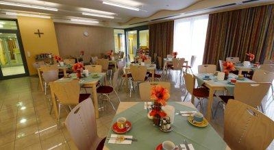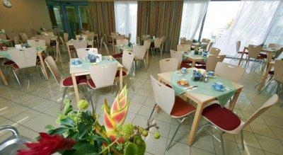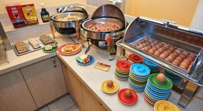 Ресторан-столовая на второи этаже. Завтраки с 7 до 11. Само помещение большое и светлое. Всего много. Хлеб-булочки, масло-джем, сыр-колбаса нарезка, мюсли-йогурты. Порадовали яйца всмятку, горячие сосиски (один день вместо сосисок был жареный бекон). Овощи-фрукты разные. Творог-сметена. Соки, чай,кофе, молоко.