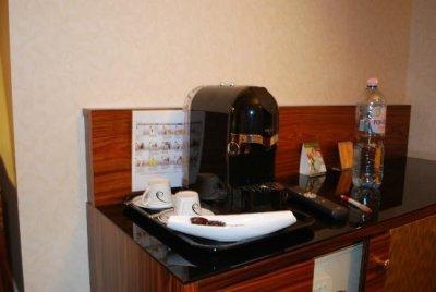 Мини-бар с достаточно высокими ценами: маленькая банка колы – 2.50 евро, пиво 0.33 – 3.50, шоколадка kit-kat – 2.30, литровая бутылка воды – 4.40. Мини-бар изначально заклеен одноразовой лентой - не очень понятно зачем. Кофе-машина, капсульного принципа. Пользование бесплатно, каждый день при уборке номера приносят 4 капсулы с разными видами кофе, сахар и сливки в одноразовой упаковке.