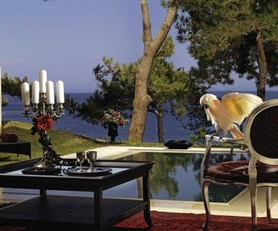 - Villa Emerald SV Размещение: 5 взрослый.– самая эксклюзивная резиденция отеля Divine Thalassa. (~360 м2 + 175 м2 прилегающей территории). Оформлена в изумрудно-зелёных тонах, является образцом изысканной современной архитектуры и дизайна, сервис на самом высоком уровне. На вилле: частный открытый подогреваемый бассейн 28 м2 (подогрев платно) с водным велосипедом, 2 спальни, одна из которых основная с огромной круглой кроватью, комната для обсуживающего персонала, 3 мраморных ванных комнаты, фитнес-зал с хаммамом, массажным столом и душевой, гостиная с камином, бар и бильярдная, столовая, кухня с отдельным входом, кабинет, собственный сад с лежаками у бассейна, обеденный стол под открытым небом,
