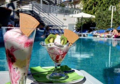Ужин : очень достойный буфет ( сыры,прошутто,вкусная красная рыба - я ее вначале игнорировала - а очень зря!,вяленые помидоры,артишоки,салаты и овощи всежие и на гриле (мои любимые баклажаны),фаршированные тунцом мелкие перчики,мидии,фрукты - и еще масса всего. Ежедневно был мой любимый инжир - присем не черный который бывает и в Москве, а редкий для наших мест белый - он очень нежный и почти не поддается транспортировке.Так что можно было насытиться и буфетом. Но !!! Впереди еще меня ждало меню - каждый раздел на выбор из 3-х вариантов - сначала супы(например крем-суп из спаржи или порчини - белых грибов) и паста разных видов, потом горячее (разнообразная рыба на гриле ни разу не повсторилась, очень вкусная телятина под разнообразными соусами). А в заключение - десерт - выбор из 5 вариантов. Обычно я выбирала вазочку с ягодами (малина-ежевика-голубика) и шариком ванильного мороженого. Очень достойная винная карта (вина и вода за отдельную плату).В ресторане есть русскоязычная официантка Яна. Вначале меня посадили в зону итальянского официанта - но Яне приходилось делать мне переводы по меню (хоть я и владею чуть ит. языком - названия не всегда могла самостоятельно осмыслить) - и я предложила ей взять меня к себе. Вечером следующегонмне поставили дополнительный столик и обслуживала меня Яна. Мы обе остались доворльны. Отмечу, что подача блюд - ресторанная.