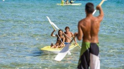 Песчаный пляж, 700 м от центрального входа в отель. Первая и вторая линии лежаков за дополнительную плату.