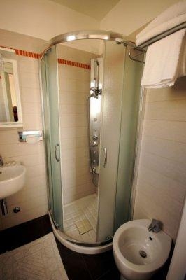 Номер по-итальянски скромный, маленький: кровать, шкаф, тумбочки, зеркало. В ванной – унитаз (куда ж без него)), биде, раковина, зеркало, душ (дырка в полу). Фена нет, в первый день выдают два кусочка мыла (потом не докладывают). Шампунь, гель, шапочку не выдают.