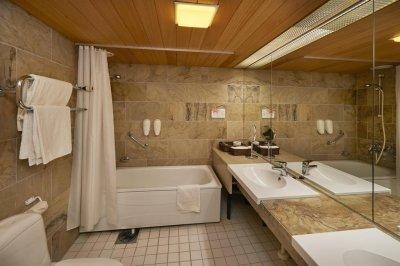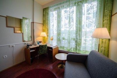 На территории отеля имеется: 64 номера 5 одноместных и 59 двухместных , 4 этажа, 2 лифта, 4 конференц-зала, игровая комната, лифт, лобби-бар, ресторан с правом продажи спиртных напитков , крытый плавательный бассейн, сауна, гараж, автостоянка электроточки для надежного запуска двигателя при низких температурах , условия для людей с ограниченными физическими возможностями.