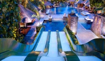 - Общее количество бассейнов: 2 - открытый бассейн лагунной формы крупнейший на Бали с уникальным песчаным островом по центру бассейна для загорания, который также служит сценой для различных музыкальных выступлений и не только - детский открытый бассейн с горочкой и площадкой для игр,