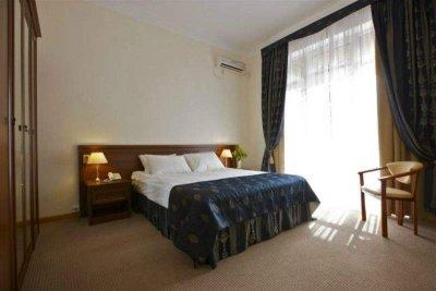 Я жила в номере "комфорт" в западном крыле с прямым видом на море (за деревьями парка), он соответствовал фото на сайте. Здесь же в торце здания располагаются люксы. На самом деле номер оказался комфортным: чистый, просторный для двоих, качественный пластик под дерево, стены, светильники в одном стиле. Есть верхнее освещение, плотные шторы, на полу ковровое покрытие. Кровати, подушки удобные, бельё белоснежное, меняли часто.