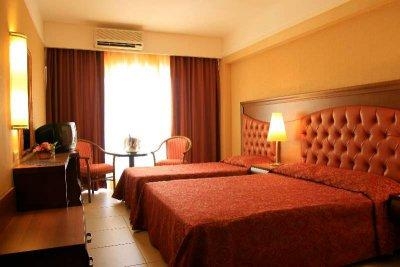 отель находится в городе, просторный, внутри очень красиво, есть лифты, номера убирают каждый день, есть телевизор, сейф бесплатный, замечательный большой бассейн, горка для детей, еда вкусная