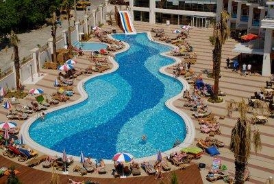 Расположение отеля: Очень удачное место, на оживленной улице, если надоест сидеть на территории - выходите в город, на каждом шагу магазинчики с сувенирами, сладостями, текстилем. Очень много местных турагенств, которые предлагают различные экскурсии по приемлемым ценам, большинство из них рассчитаны для русских, всё на русском. Несколько больших супермартеков поблизости: Мигрос, Кипа, Outlet, где можно очень дешево купить купальники, футболки, сувениры. До центра города около 1 км, можно прогуляться пешком, или на маршрутке (голубая), ходит каждые 10 мин, останавливается по требованию. В центре города рынок, банки, площадь Ататюрка, пристань яхт, крепость с музеем, улица баров.