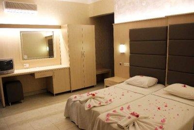 Отель оказался очень маленьким, но вполне удобным, первый корпус (меня разместили в нем) находится прямо на берегу, в нем же расположен бар, ресторан и бассейн. Второй корпус расположен через дорогу, но при этом все такое маленькое, что расстояние от второго корпуса до пляжа действительно не превышает 50 метров. Находится отель в очень маленьком поселке Турунч под Мармарисом. От Мармариса, на мой взгляд, далековато (20 км) но это уж кому что нравится, Турунч следующий поселок после Ичмелера в сторону Бодрума. Территории всего поселка хватило бы максимум на четыре хороших 5* отеля класса Divan Mares (что между Мармарисом и Ичмелером). Зато на пляже поселка поднят международный голубой флаг, символизирующий особую чистоту воды. Номер в отеле оказался неплохо отремонтирован, но очень тесен, в прочем мне одному места хватало. Вопреки многим отзывам в моем номере был телевизор, который принимал два русскоязычных канала. Телевизор и бесплатный сейф в номере оказались для меня приятным сюрпризом, на это я не рассчитывал (правда, класть в сейф мне было нечего-)). Зато мебель!!! Шкаф моей прабабушки, который стоит у меня на даче выглядит лучше, чем шкаф в номере этого отеля. Еще в номере имелся минибар, абсолютно пустой!!! Сначала я подумал, что это такая изощренная издевка турков, пустой минибар при питании ALL. Потом я обратил внимание на не шуточное тепловыделение этого электроприбора и решил, что он выполняет функции обогревателя -)). За несколько дней до отъезда меня осенила мысль, если бы я прикупил бутылочку "Бэлиса" в дюти-фри, я смог бы охладить ее. Так что, возможно, кому-то минибар окажется не лишним. Душ в санузле закреплен на стене, снять его не возможно. Для некоторых это может показаться не удобным, но у меня нареканий не вызвало, тем более что мне уже приходилось сталкиваться с такой конструкцией (см. мой отзыв по Таиланду). Душевая кабина очень тесная, даже мне одному было в ней тесновато. Попытка принять душ вдвоем, если и окажется возможной, превратится из процедуры гигиенической в эротическую.