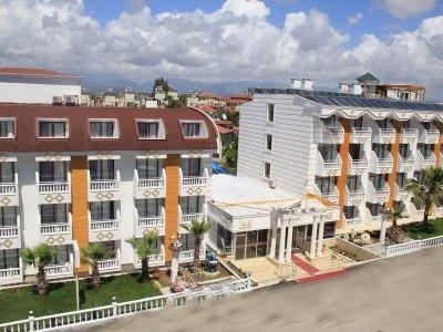 65 км от аэропорта Анталья, 3 км от центра Сиде, в поселка Манавгат. Территория гостиницы занимает 1700 м2.