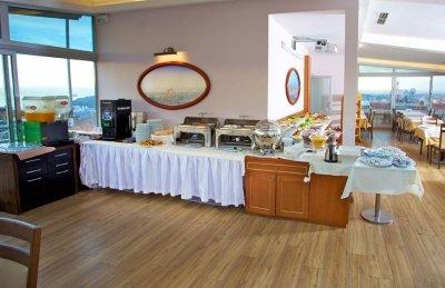 Завтрак проходит на 7-м этаже на застекленной терассе. С видом на Золотой рог, Голубую мечеть, Айя Софию, Долмабахче. В общем, сплошная красота. Сам завтрак не особо заслуживает похвалы. Даже не из разряда "голодными не останетесь", скорее "терпимо". Самое приятное из завтрака-чай с видом на город, из-за которого мы и заказывали отель. Но для меня осталось загадкой, зачем этот прекрасный вид загораживать вазонами.
